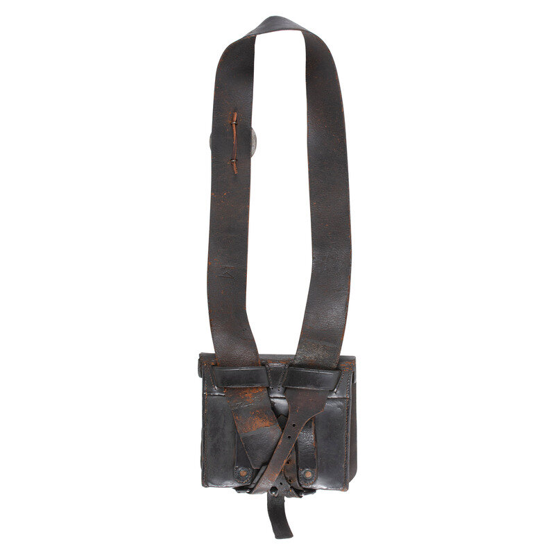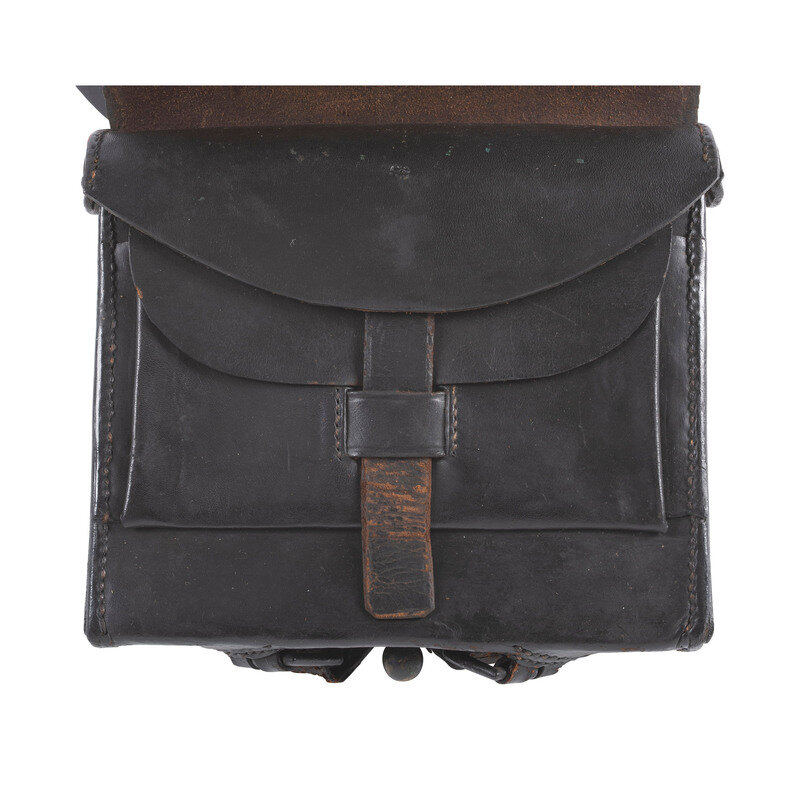 7.125" wide by 6.125" tall cartridge box, exterior dimensions with flap 8.25" wide by 6.75". Sewn latch tab without reinforcing rivet on face, rivet reinforced belt loops on rear as well as provision for sling wear with slots and two japanned buckles. Box with implement pouch on inner face and both tin magazines intact. Unmarked. Sling attached with Eagle breast plate.