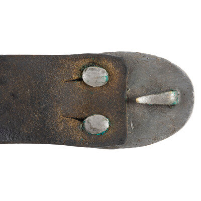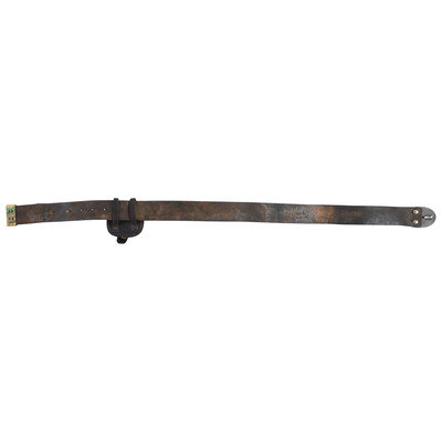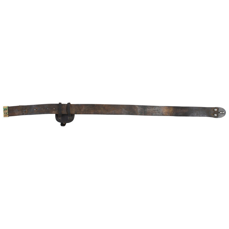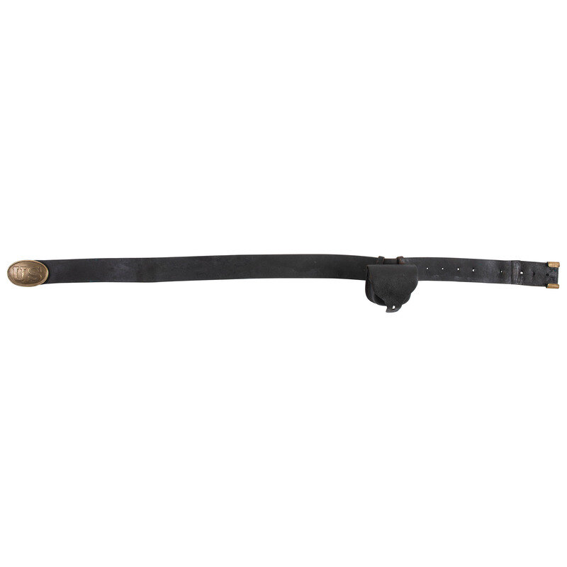 42.25" long, 1.9" wide blackened bridle leather infantry belt with brass keeper, mounted with a Gaylord style lead covered puppy paw stud, lead filled stamped brass US belt plate. Belt has been field modified with a sewn on extension to allow it to fit a large waist size and has an illegible maker's or inspector's stamp on it. An unmarked cap pouch is attached to the belt. The cap pouch retains the fleece lining and an original cone prick.
