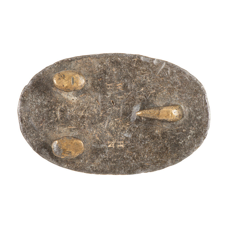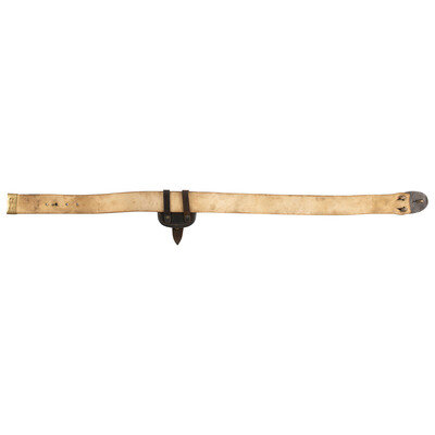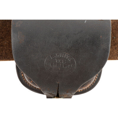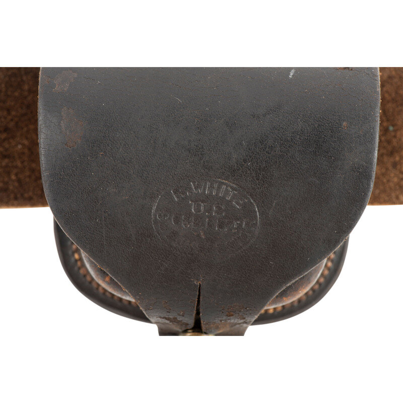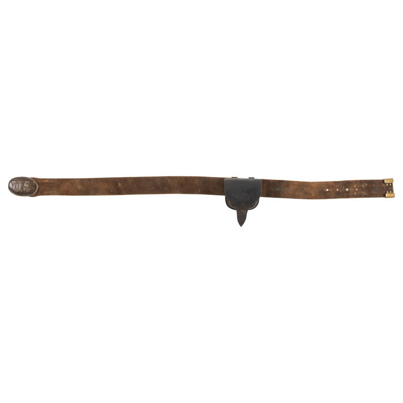 39" long, 1.88" wide blackened buff leather infantry belt with brass keeper, mounted with a puppy paw lead filled stamped brass US belt plate with a weak WH SMITH/BROOKLYN maker's mark on the rear face. An SH Young maker marked cap pouch with an R WHITE inspection on the outer flap is attached to the belt. The cap pouch retains the fleece lining and an original cone prick.
