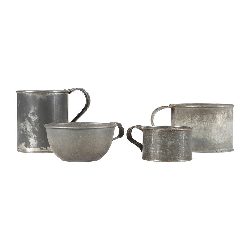 Lot of four tin cups ranging in height from 2" to 4", and in diameter from 3" to 4.25". All items feature handles. One cup is pressed tin with a riveted handle while the others are soldered construction with handles attached via wire, rivets, and soldering.