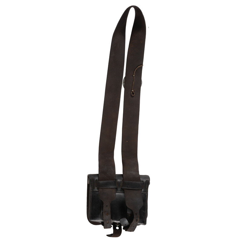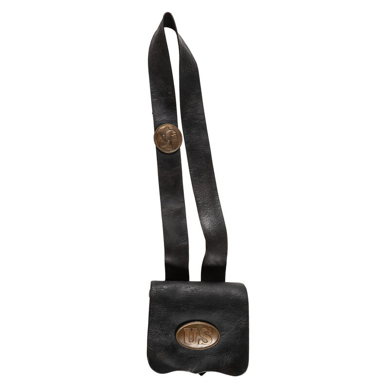 8" x 2.75" x 7.5". Black leather cartridge box with leather sling mounting plates to the sling and flap. Cartridge box displays maker marking GARCELON & COVELL/1863/LEWISTON MS. Features two soldered tin liners. Brass US plate affixed to the flap with the shoulder strap mounting the {United States Eagle} looking over its left wing clutching three arrows and an olive branch. Item features angled buckles retaining the strap, a brass stud, and an intact tie down strap.