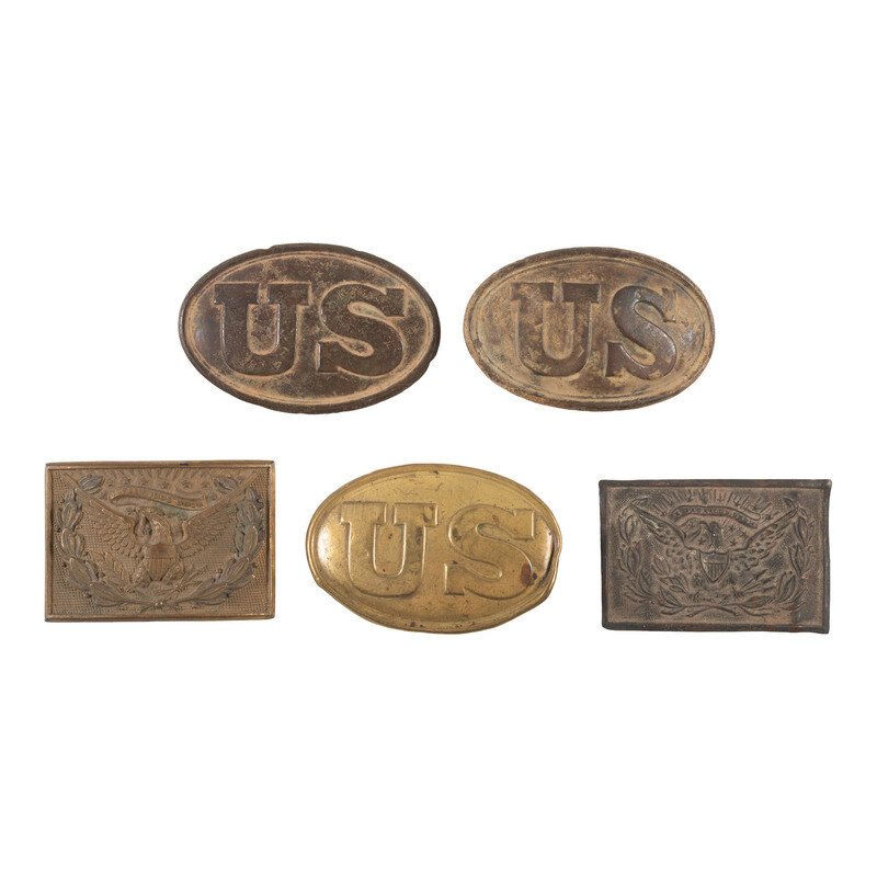 1.) Dug US Cartridge Box Plate: 3.41" x 2.25" stamped brass face with lead filled back, iron loops missing.