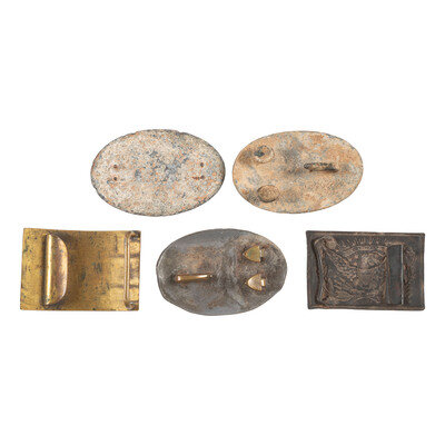 2.) Dug US Puppy Paw Belt Plate: 3.3" x 2.12" stamped brass face with lead filled back, puppy paw studs, pronounced curve to face. All hooks intact. Collector's note with plate says "Richmond area".