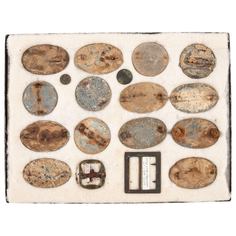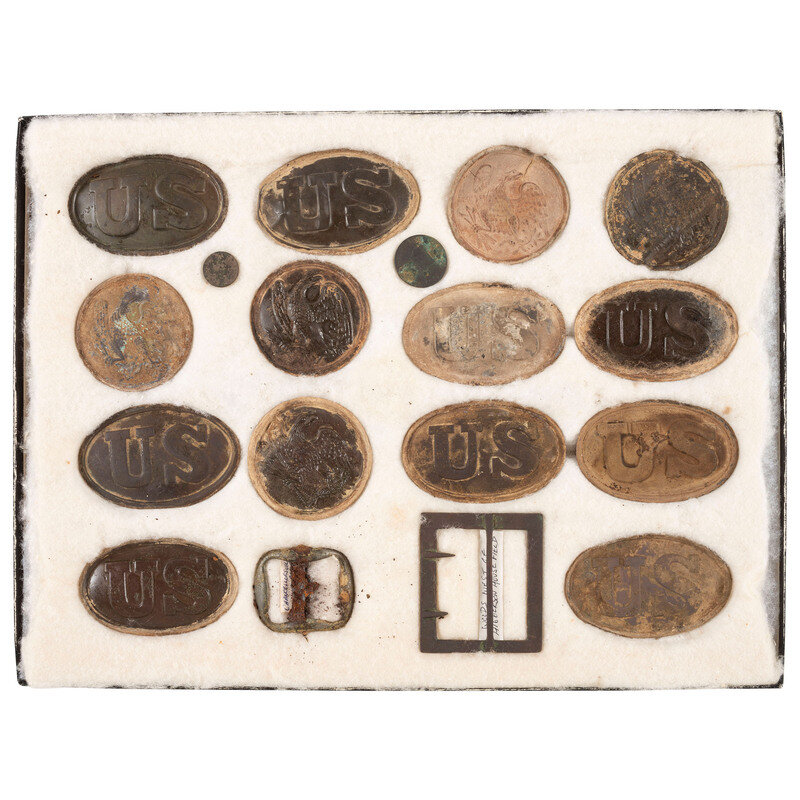 The group includes 8 dug US box plates with varying amounts of their wire loops remaining, 1 dug US puppy paw plate with studs, 5 dug US breast plates with varying amounts of the wire loops remaining, a Confederate fame buckle measuring 2.9"x2.52" and a sash buckle and two coin buttons. Most of the plates have old notes about where they were recovered with most being from the Wilderness battlefield area in between 1973 and 1979.