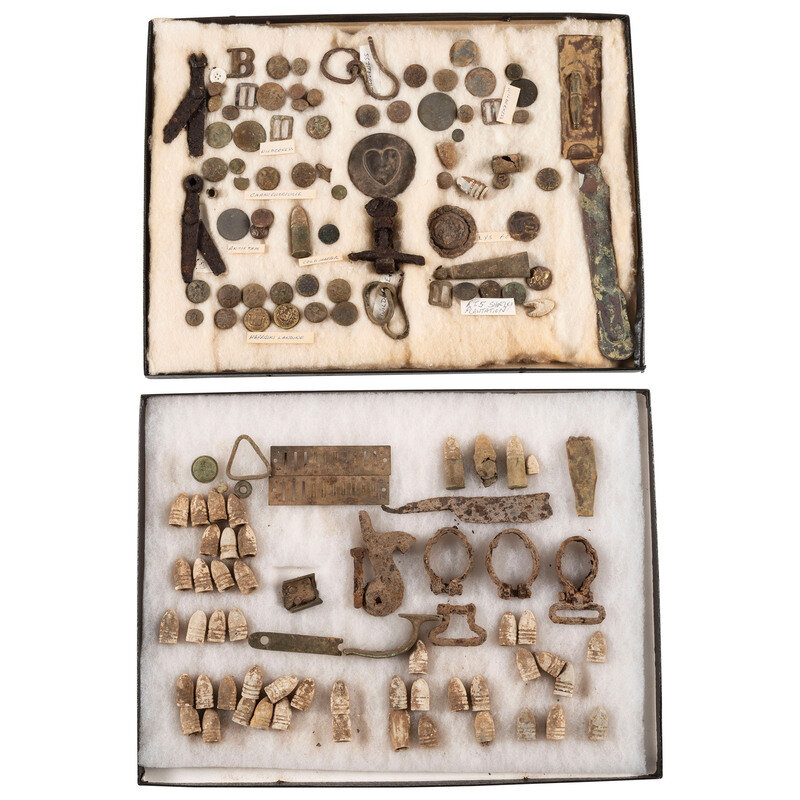 Riker cases contain assorted relic condition artifacts including: 52 bullets, an assortment of buttons, three barrel bands, Springfield rifle hammer, two harmonica reedplates, two nipple wrenches, and more. Cases fitted with labels indicating where these assorted artifacts may have been recovered. No provenance.