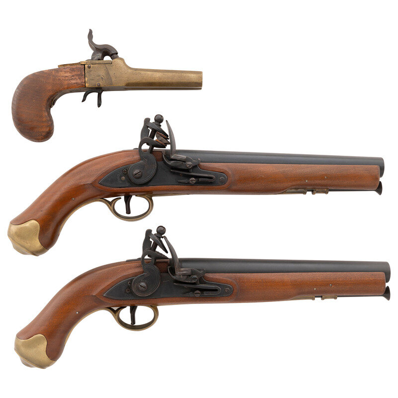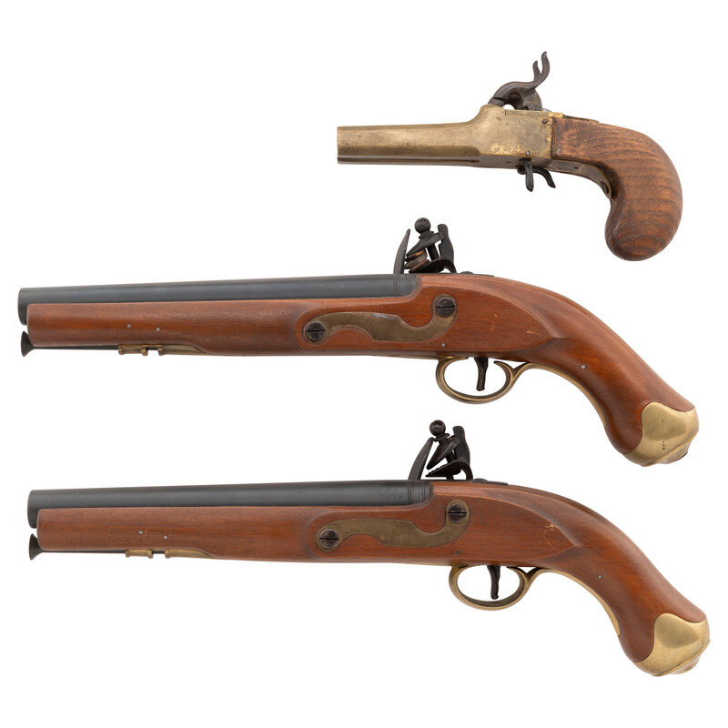 3.) Unmarked Reproduction Brass Double Barrel Percussion Pistol. .38 caliber, 3.5" barrels. Brass, blued small parts, wood grip. Two barrel smoothbore muzzleloading percussion pistol with two triggers.