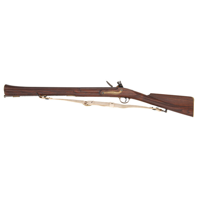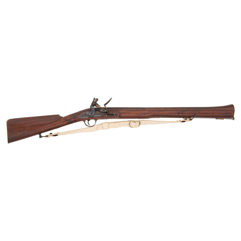 About 10 gauge bore that flares out to 2.125" diameter at muzzle. 23.5" octagonal to round barrel. Browned metal finish. Walnut stock has a plain straight grip and forearm, with simple moulding around barrel shank. SN: NSN. Contemporary smoothbore flintlock blunderbuss without sight. Item features double sling swivels, a contemporary white leather sling, and button head steel ramrod. Markings include U.S. stamped to center of lock and RAPA/FORGE crudely engraved to tail of lock. Brass sideplate is also crudely engraved LIBERTY/OR/DEATH. Barrel is marked with modern British proof marks.