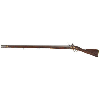 .72 Cal. 41.125" barrel length. SN: NSN. Bright metal finish overall with blued frizzen spring, cock screw, and trigger with brass furnishings set in walnut straight wrist full length stock. Lockplate is marked POTZDAM MAG/stD. Item fitted with a brass escutcheon showing the cipher of Prussian King Frederick II.