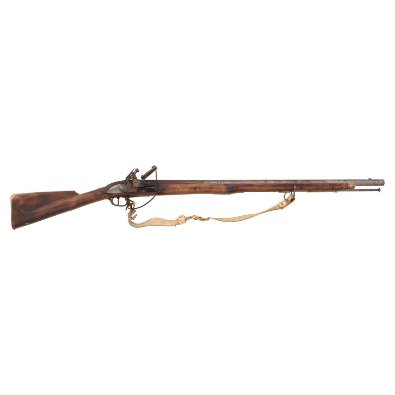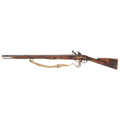 .75 Caliber. 33" barrel length. SN: 023. Bright metal finish overall with brass escutcheon to the wrist and further brass fittings. Single shot flintlock musket set in walnut straight wrist stock with palm swell to forend, and front sight/bayonet lug to forward barrel. Lockplate is engraved TOWER behind the cock, and {Crown/GR} forward of it. Item comes with brass guard to pan, leather and flint to cock, leather frizzen guard, and a reproduction white leather sling.