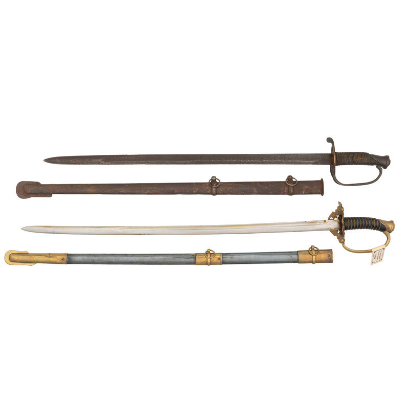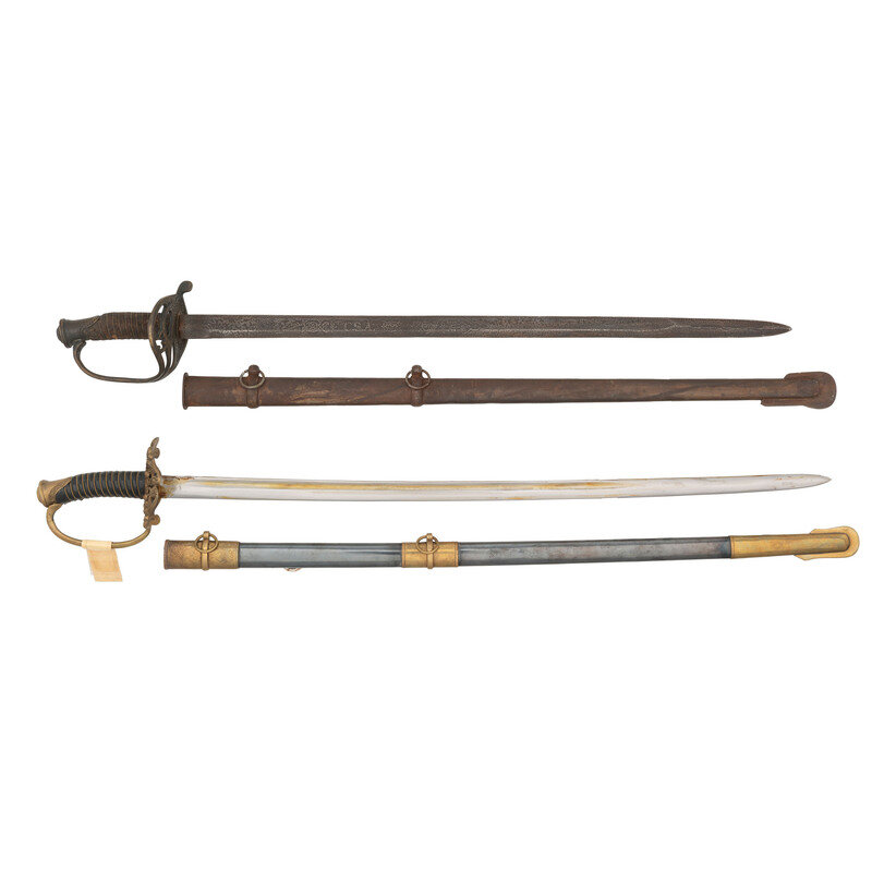 1.) 30" blade length. 38" overall with scabbard and hilt. Straight single edged fullered blade with spearpoint tip and 6" false edge mounting a brass hilt with leather wrapped handle and three branch brass guard. Blade is etched with Arabesque borders, C.S.A. initials and waving "Stars and Bars". Item comes with an all steel scabbard. Sword and scabbard have been artificially aged, and bear imitation Thomas Griswold marks.
