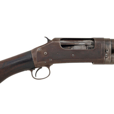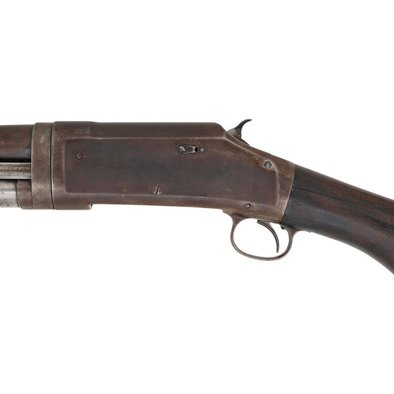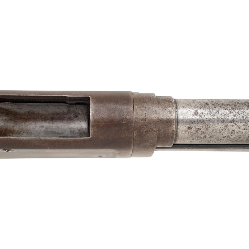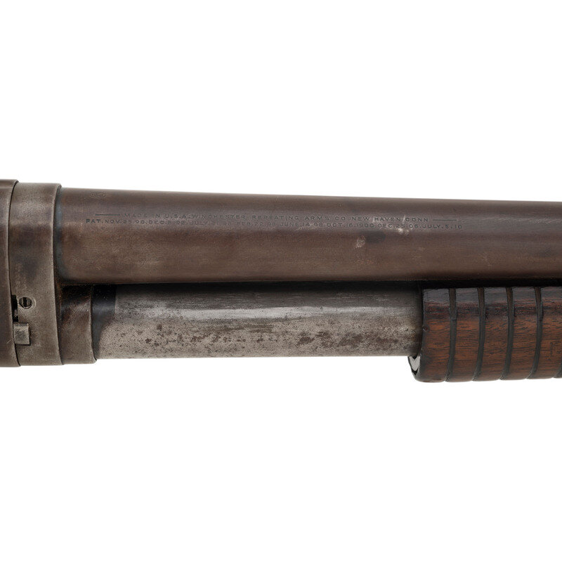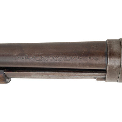 12 Gauge. 32" barrel length. SN: C126950. 2.75" chamber length. Full Choke. Blued metal finish with round knob semi-pistol grip walnut stock and corncob forend mounting brass bead front sight. Slide-action repeating shotgun fed by an internal half length tube magazine and featuring a takedown frame. Left barrel shows standard model markings reading MODEL 97-WINCHESTER-12 GA./-TRADE MARK- followed by FULL choke marking. Right barrel address reads -MADE IN U.S.A. WINCHESTER REPEATING ARMS CO. NEW HAVEN CONN-/PAT. NOV. 25. 90. DEC. 6. 92. JULY. 12. 96. FEB. 22. 98. JUNE. 14. 98. OCT. 16. 1900. DEC. 25. 06. JULY. 5. 10. Barrel serial number does not match the receiver, and reads 809915.