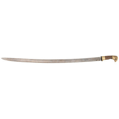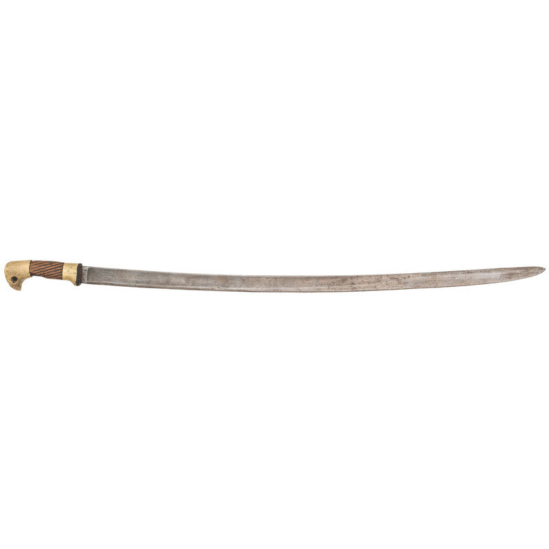 33.7" blade length. 39.125" overall with hilt. Slightly curved single edged blade with single fullers running 23" along the blade, brass pommel and guard, and wood grips with carved grip serrations. Sword is dated 1917 on the right ricasso and shows a Zlatoust manufacture stamp enclosing the {Imperial Russian Eagle} marking. Further scattered arsenal stamps to the guard and ricasso including {Crown/A} and A marks, and the number 42 to right ricasso. Item features a birdshead pommel with lanyard loop.
