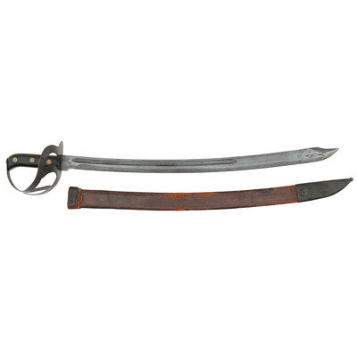 24.675" blade length. 30.5" overall with scabbard and hilt. Blued metal finish overall to single edge curved sword with clipped point, 2" sharpened false edge, and 14.5" fuller to both sides. Item mounts a blued steel guard with three branches to the knuckle bow and synthetic grip scales with brass fasteners, and a screw tang. Scabbard is leather with blued throat and drag. Item is clean and unmarked, typical of 1941 Milsco produced Klewang Cutlasses.