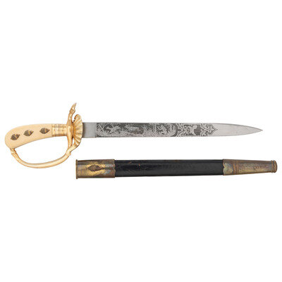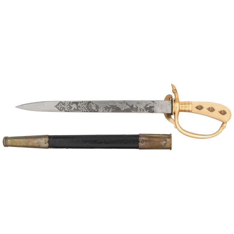 13" blade length. 19" overall with scabbard and hilt. Straight single edged spearpoint blade with gold plated alloy hilt mounting bone grips. Half clamshell guard with the knuckle bow and quillon terminating in a deer hoof. Grips adorned with three acorns to each side. Blade is signed ORIGINAL/Eickhorn/SOLINGEN with {Squirrel and sword} motif. Blade is acid etched with hunting scenes along both flanks. Obverse side decorated with a scene of a hunter sighting his rifle on a doe and stag in a forrest. Reverse features a hunter pursuing a wild boar with six hunting dogs closing on the prey. Back of the blade adorned with oak leaves and acorns. Comes with a wood core leather scabbard with brass throat and drag.