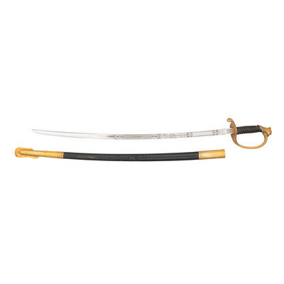 28.6" blade length. 35.5" overall with scabbard and hilt. Curved single edged spearpoint stainless steel sword with etched designs to the blade, brass hilt, and wire wrapped leather grip. Left ricasso is marked with the etched manufacturer marking TRADE MARK/HILBORN/HAMBURGER/INC./NEW YORK/MADE IN/SOLINGEN/GERMANY with the right featuring a golden PROVED marking in a {Star of David}. Blade is adorned with banners enclosing UNITED STATES MARINES followed by the Revolutionary War flag above a shield with the seal of the United States Marine Corps. Blade is inscribed to Virgil C. Collins in Gothic script. Comes with a black leather wrapped scabbard with brass throat and drag.