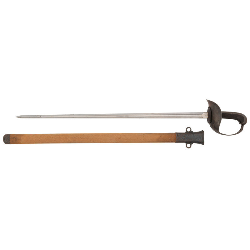 35" blade length. 44" overall with scabbard and hilt. Straight double edged fullered blade with spearpoint tip, checkered black synthetic grip scales, and checkered steel backstrap. Right ricasso is struck U.S., while the manufacturer mark on the left reads L.F. {Ordnance Bomb} & C./1918, indicating it was manufactured by Landers, Flary & Clark in 1918. Sword features a blued cup hilt with triple reinforcing corrugations over the knuckle bow. Comes with khaki canvas wrapped scabbard with blued throat and drag.