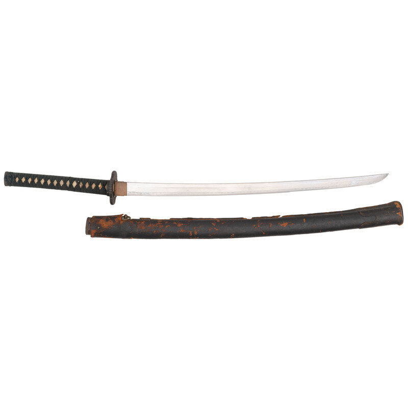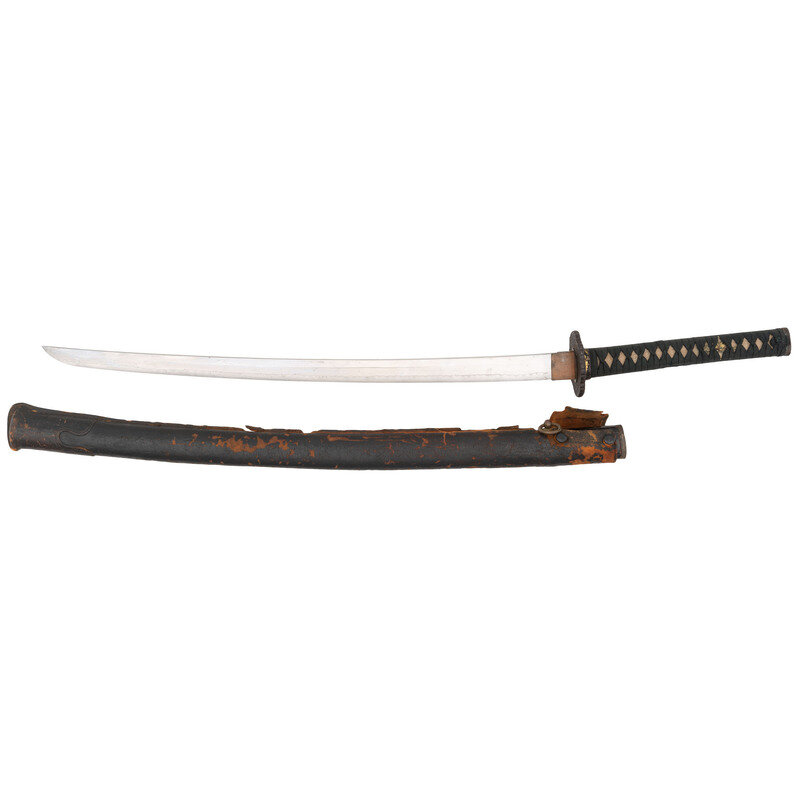 24" nagasa. 38.5" overall. Shinogi-zukuri blade with a two hole nakago that is unsigned, possibly altered at some point. Blade features an O-kissaki, ihori mune, omaru boshi, notare hamon, and muji hada. Blade is mounted in a black lacquered saya wrapped with leather covering. Tsuka has blue ito, white same, iron fittings with gold accents. Tsuba is chiseled with wavy designs and has a single hitsu-ana.