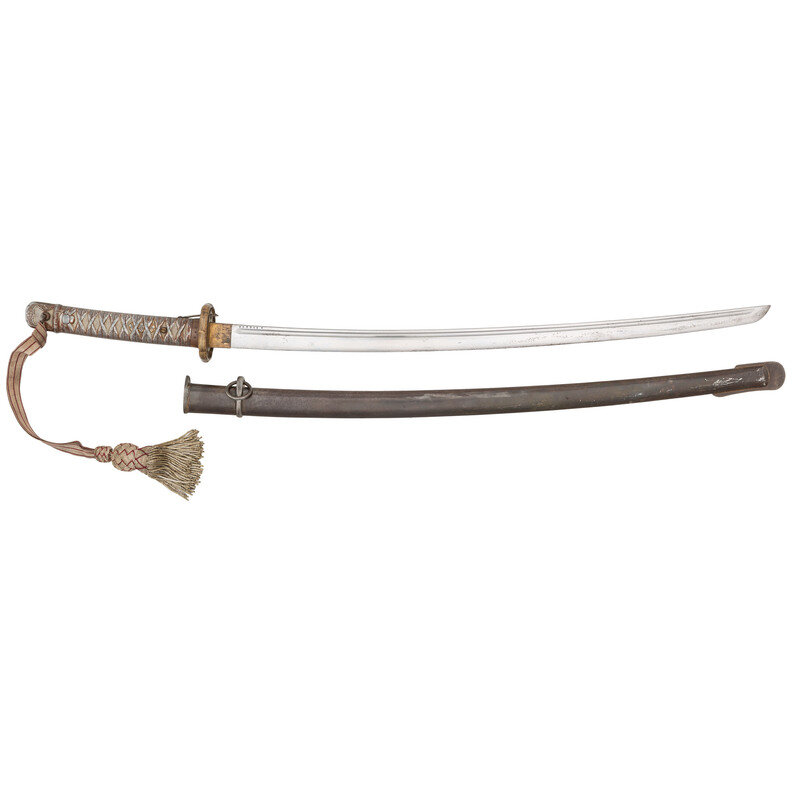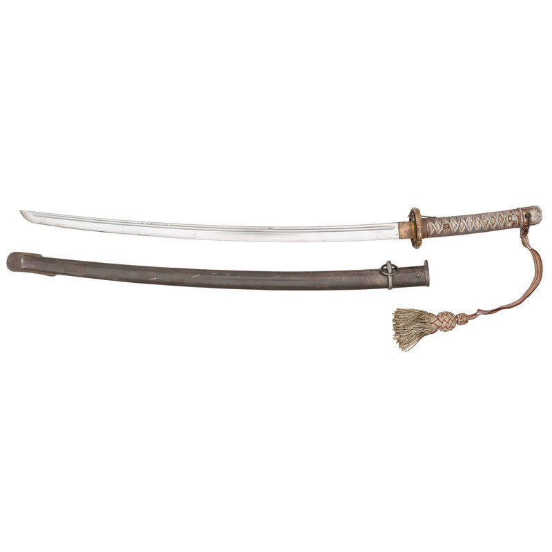 27.5" nagasa (blade length). 38.25" with tsuka (hilt) and saya (scabbard). Machine made curved single edged blade with single fullers, shinogi zukuri style blade with brass habaki and tsuba mounting cast aluminum tsuka patterned after the fittings of a standard Shin Gunto sword. Hilt is patterned to resemble one with a rayskin handle wrapped in silk cord, and sakura menuki, and is painted to create this effect. Item features a spring catch above the back of the blade that locks into its all metal scabbard. Serial number to the blade is 147701, and does not match the saya, which is numbered 148483.