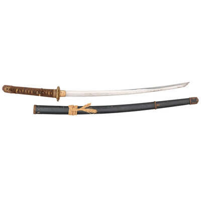 22.75" nagasa. 40" overall. Shinogi-zukuri blade with a nakago that has a large and small mekugi-anas. Blade features a chu-kissaki, no visible boshi, ihori mune, muji hada, and a hamon that appears to be midare-gunome or midare-sanbonsugi with nie. Blade is mounted in shin-gunto koshirae including a black painted steel saya with sageo, copper mounts, brown ito, white same, three piece alloy seppa sets, and a gilt cherry blossom tsuba.