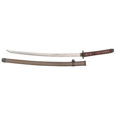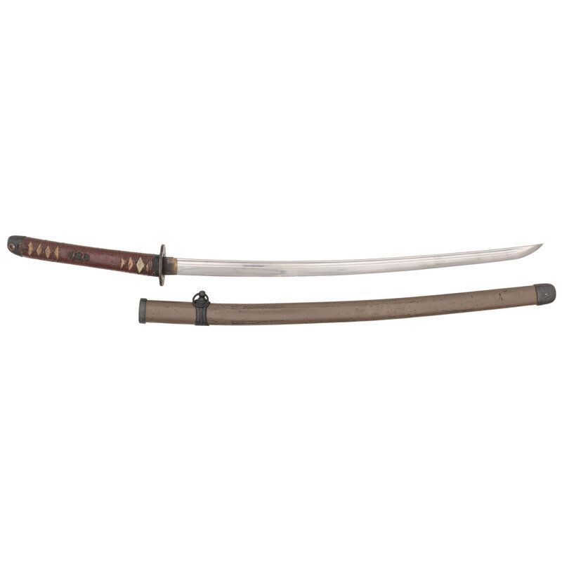 25.5" nagasa. 39" overall. Shinogi-zukuri blade with a single hole nakago that is signed with six character mei and a Showa stamp. Blade features bo-hi to entire length of both sides, an O-kissaki, ihori mune, possible jizo boshi, suguha hamon, and mosame or muji hada. Blade is mounted in late war style gunto mounts with painted steel scabbard, iron cherry blossom fittings, brown/red lacquered ito, white same, and simple chiseled iron tsuba.
