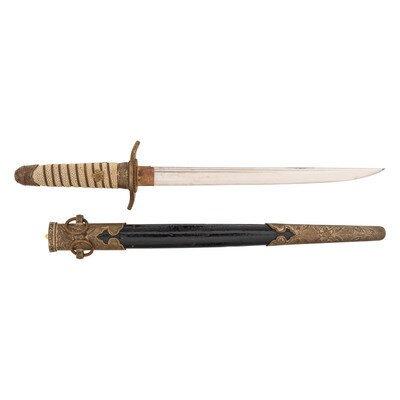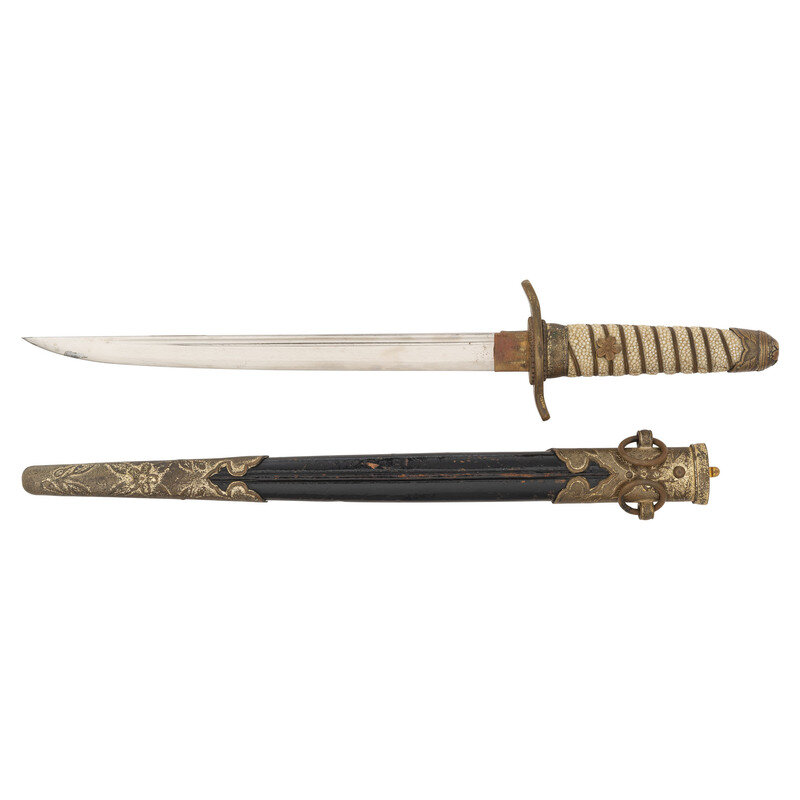 9" blade length. 16.5" overall with scabbard and hilt. Straight nickel plated blade with hira-zukuri shape and single fuller to both sides. Item mounts a white rayskin wrapped hilt with brass fittings and a gold washed copper habaki. Shagreen hilt is wrapped in brass wire with sakura buttressing the mekugi. Item features an S-curve guard with further sakura blossom designs adorning the pommel, chape, and locket. Scabbard composed of lacquered wood with brass fittings featuring nanako grounds, and features a spring-loaded catch that locks into the guard. Guard struck with a {Sakura enclosing Anchor} design, and a kanji marking on opposite sides of the blade.