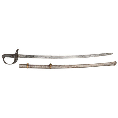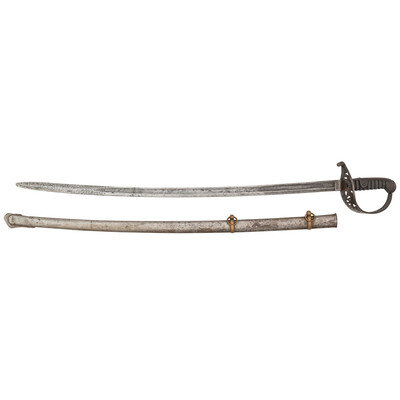 33.75" blade length. 41.25" overall with scabbard and hilt. Slightly curved single edged blade with spearpoint tip featuring single 25" fuller to each side of the blade, and mounting a pierced steel cup hilt with shagreen wrapped grips. Sword is marked on the right ricasso with {Swiss Cross}/WESTER & CO/SOLINGEN with the left marked EISENHAUER. Cup hilt is lightly engraved with floral embellishments enclosing a {Swiss Cross} over the knuckle bow. Backstrap features a horizontally serrated thumb rest. Scabbard is bright steel with brass hangers, and no visible maker marks.