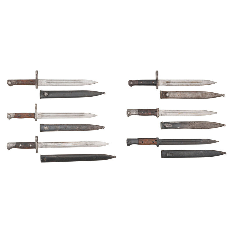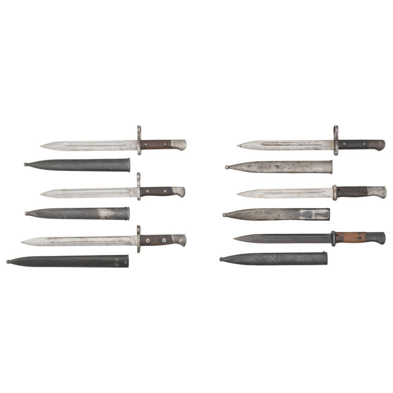 1.) Lot of three Chilean bayonets. Blades range from 10" to 11.8" in length and come with blued metal scabbards and walnut grip scales. One displays clear German production marks. Remainder are unmarked except for serial numbers.