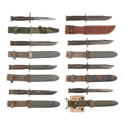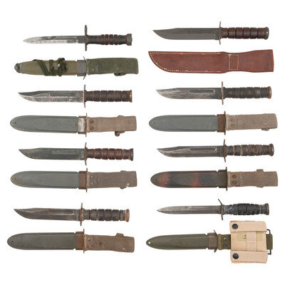 Also included is one M3 fighting knife in a US M8/BM CO marked fiber scabbard with green canvas hanger, an M4 Bayonet with inexpertly ground edges in a US M8A1/PWH marked fiber scabbard, and a reproduction Ka-Bar knife marked USMC and KA-BAR/OLEAN, N.Y. on the ricasso in leather sheath with {USMC seal}.