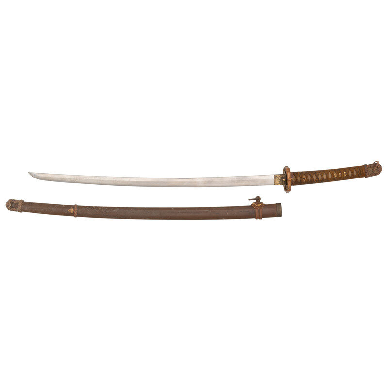 26" nagasa. Shinogi-zukuri blade with a single hole nakago that is unsigned. Blade features a chu-kissaki, obscured boshi, ihori mune, suguha hamon, and muji hada. Blade is in shin-gunto mounts including a painted steel saya, pierced tsuba, gilt copper fittings, three piece seppas, brown ito, white same, and brass or gilt catch spring.
