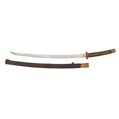 26" nagasa. Shinogi-zukuri blade with a single hole nakago that is signed with long mei to both sides, as well as a Showa stamp and the turtle stamp of Asano Kanezane. Blade features a O-kissaki, obscured boshi, ihori mune, muji hada, and gunome-toran hamon with ashi. Blade is in shin-gunto mounts including leather wrapped wood saya, two piece seppas, brown ito, white same, gilt copper fittings.