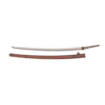 28" nagasa. 36" overall. Shinogi-zukuri blade with a single hole nakago that is signed with Showa mei on both sides. Blade features a chu-kissaki, omaru boshi, ihori mune, midare-suguha hamon, and muji hada. Blade is mounted with a red painted shin-gunto saya and copper habaki.