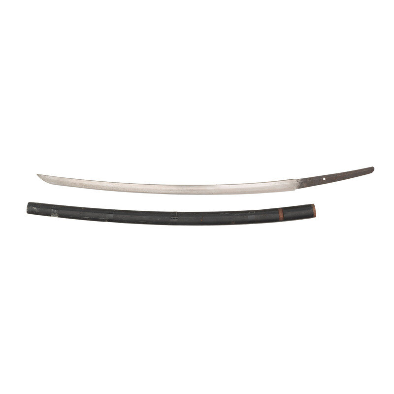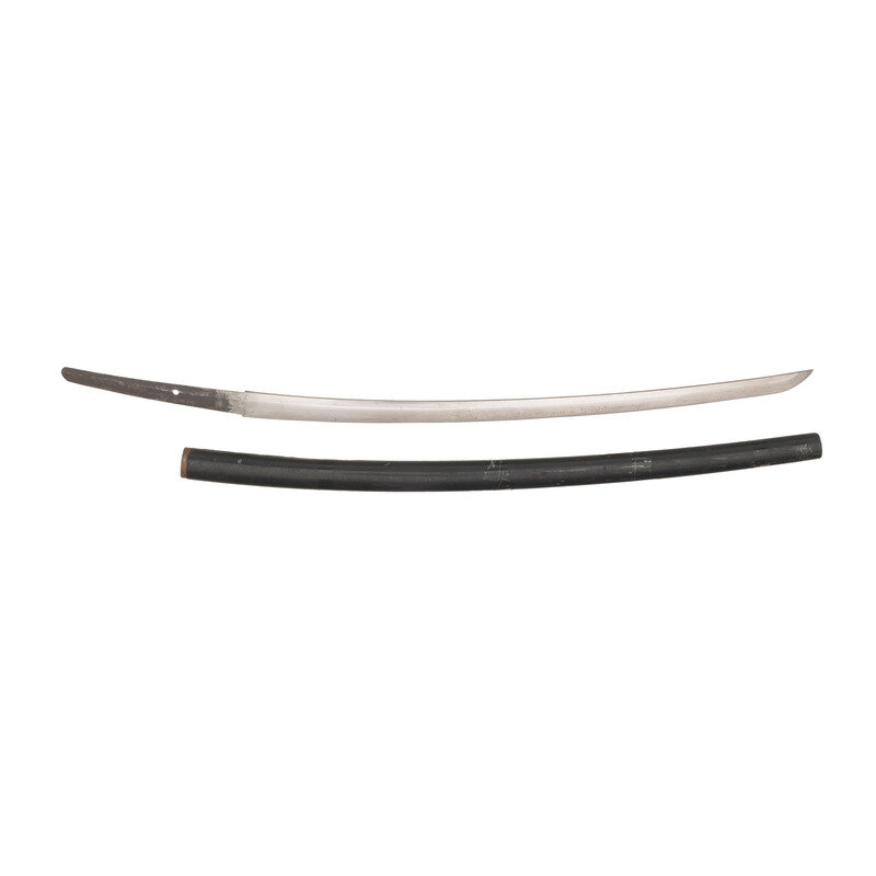 27.5" nagasa. 37" overall. Shinogi-zukuri blade iwth a single hole nakago that is signed on both sides with long mei and a Showa stamp. Mei on one side possibly gimei, it looks very crude. Blade has a chu-kissaki and ihori mune, but other characteristics have been obscured by a bad polish or attempt to clean blade. It is only mounted in a black lacquer rayskin saya.