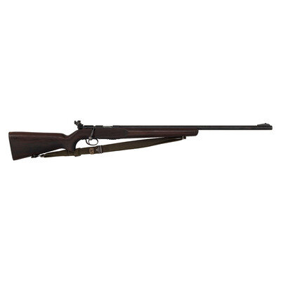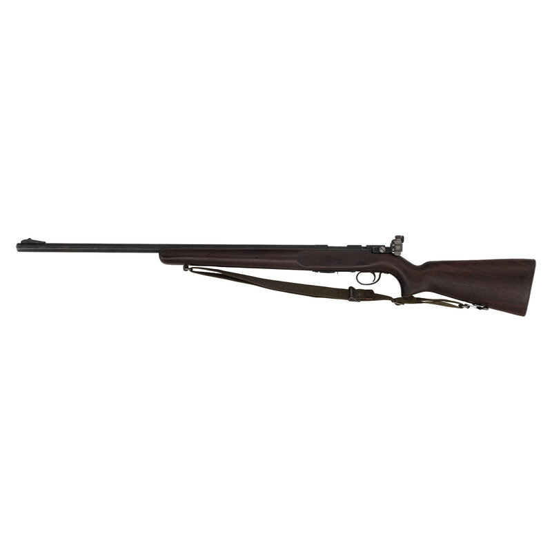 .22 LR. 27" heavy barrel length. SN: 61168. Blued metal finish. Walnut stock has a plain semi pistol grip and target forearm. Bolt action rifle with a Redfield adjustable rear peep sight and low profile blade front sight. Item features a removable magazine, double sling swivels, checkered steel buttplate, and an OD sling. Markings include Remington manufacturer marks to barrel, U.S. PROPERTY marks to receiver and barrel, and MILITARY FINISH also to top of barrel. Numbers 41 16 0182 are signed to barrel with electro-pen. Stock shows several cartouches included FJA Frank J. Atwood to left panel, LEAD/RA to left side of butt, P proof to grip, and a painted orange triangle mark to bottom of grip.