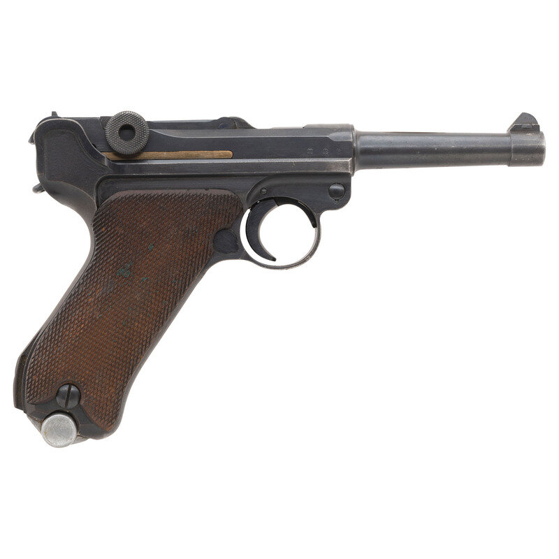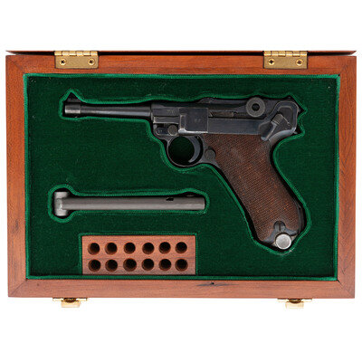 9mm Para. 3.9" barrel length. SN: 1497n. Blued metal refinish overall mounting checkered walnut grips, matted front blade and toggle notch rear sights. Short recoil operated striker action autoloading pistol fed by detachable single stack magazines and utilizing a toggle locked action. Item shows S/42 mark to the toggle link, indicating it was manufactured by Mauser. Item further displays the 8,82 bore gauge marking, and a G date marking on the top of the barrel extension indicating it was made in 1935. Serial numbers are mixed with the numbers of the frame components matching one another, while the toggle and barrel serial numbers match in a different series of number 2273. Item shows standard GESICHERT safety marking, and GELADEN marking to the extractor. Item comes with one WWII era chrome plated magazine with aluminum base plug showing Waffenamt marking and serial number. Pistol additionally comes with one post-war magazine, and a green velvet lined walnut case with brass hinges.