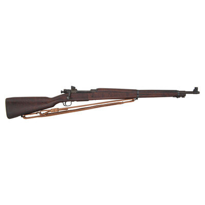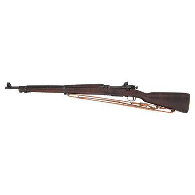 .30-06. 24" barrel length. SN: 3402098. Parkerized metal finish overall set in walnut semi-pistol grip stock mounting adjustable rear aperture and front blade sight with protector. Bolt action internal magazine fed repeating rifle with stamped triggerguard and fittings, and four groove rifling. Barrel bands and sight protector are blued with the latter piece stamped R. Receiver marked U.S./REMINGTON/MODEL 03-A3 with the barrel showing RA/{Ordnance Bomb}/2-43. Item mounts a reproduction Model 1907 style leather sling and comes with a two chamber synthetic oiler. Stock is unmarked with rounded edges indicative of sanding.