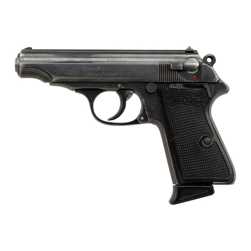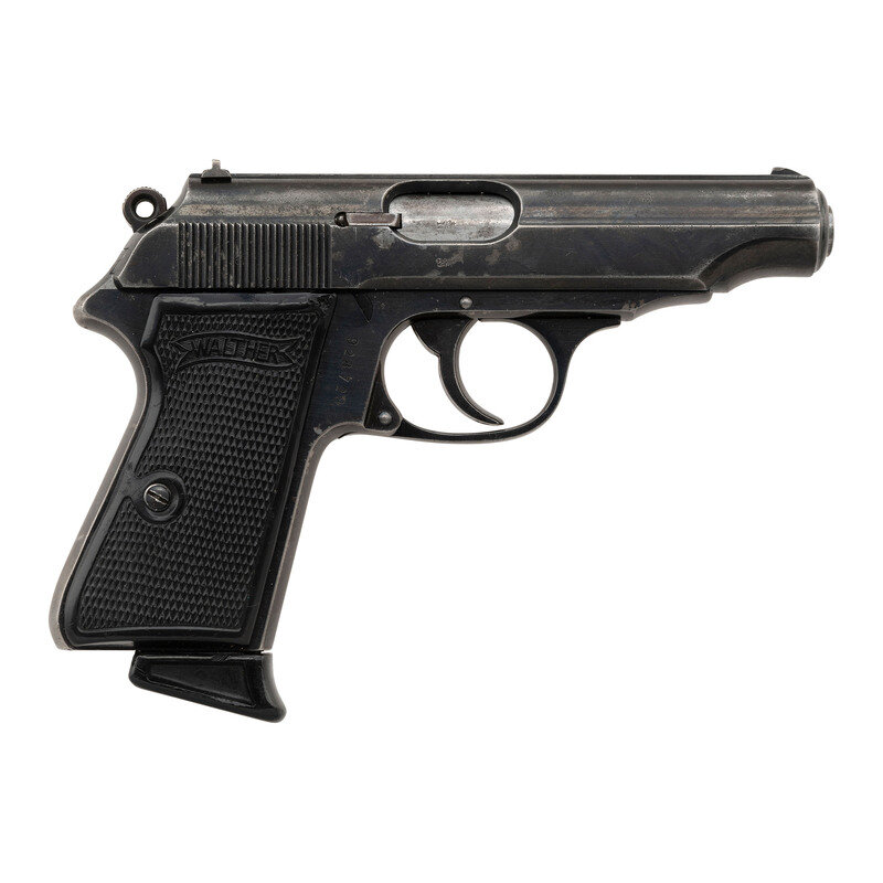 .32 ACP. 3.9" barrel length. SN: 928728. High polish blued metal finish with polished chamber mounting WALTHER banner marked two piece black Bakelite grips and fixed front blade with drift adjustable rear notch sights. Simple blowback operated DA/SA autoloading pistol fed by detachable single stack magazines. Markings include WALTHER banner to the left slide followed by Waffenfabrik Walther, Zella-Mehlis (Thur.)/Walther's Patent Cal. 7,65 m/m Mod. PP. Further markings include {Eagle/N} commercial proofs to the right slide and chamber. Comes with one blued magazine marked WALTHER/PP 7,65mm with black Bakelite finger extension.