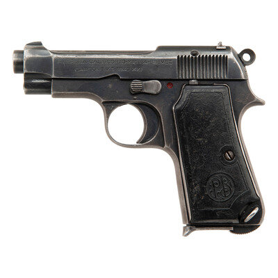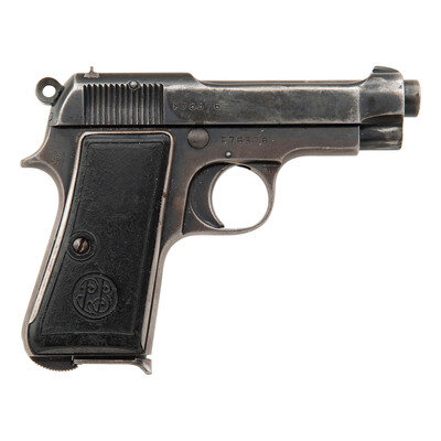 .380 ACP. 3.3" barrel length. SN: F76376. Blued metal finish mounting black synthetic PB logo grips and drift adjustable rear notch with fixed blade sights. Simple-blowback operated single action autoloading pistol fed by detachable single stack magazines. Manufacturer markings to the left slide read P. BERETTA-CAL.9CORTO-Mo 1934-BREVET./GARDONE V.T. 1942 XXI. Left frame is struck with the {Crown/Eagle} marking of the Italian Air Force with the right frame exhibiting a boxed UA/47 stamp.