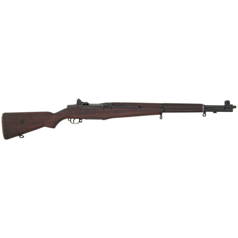 .30-06. 24" barrel length. SN: 5609569. (Mfg ca 1955) Parkerized metal finish in walnut semi-pistol grip stock mounting T105 pattern adjustable rear aperture and front blade sights with protectors. Long stroke piston driven semi-automatic rifle with rotating bolt. Receiver shows the manufacturer marking U.S RIFLE/CAL. .30 M1/H. & R. ARMS CO. Barrel is dated 4-55, indicating it was made in April, 1955. Wrist is struck with the circle P mark, and both the barrel and left wrist display the Department of Defense marking.