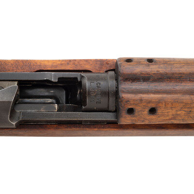 .30 Carbine. 17.75" barrel length. SN: 3402514. Parkerized metal finish with walnut semi-pistol grip stock mounting late-pattern adjustable rear aperture and front blade sights with protectors, bayonet lug/handguard retainer, and rotary safety. Short-stroke piston driven semi-automatic rifle fed by detachable double stack magazines. Item shows the standard model and caliber markings to the forward receiver, and SAGINAW SG to the rear receiver near the serial number. Stock is unmarked, and likely replaced. Mounts an UNDERWOOD/6-43/{Ordnance Bomb} marked barrel, indicating it was made by Underwood in June of 1943, and was likely a replacement. Receiver shows a punch dot pressure proof mark, and mounts a flat top bolt. Item comes in a CMP box with CMP manual, reproduction operator's manual, and an A.I. marked magazine by Inland.