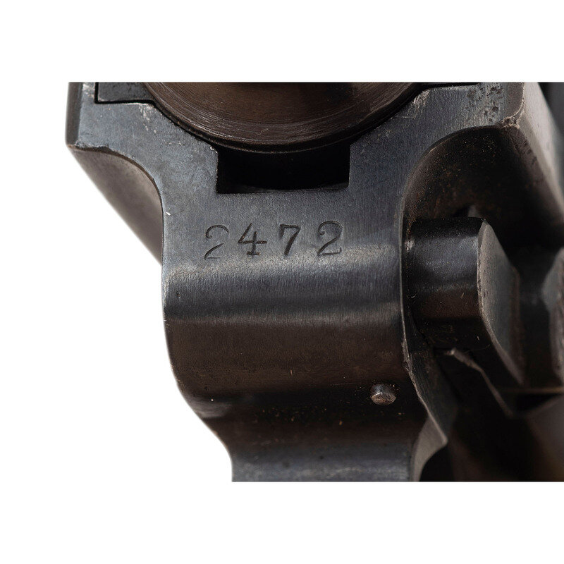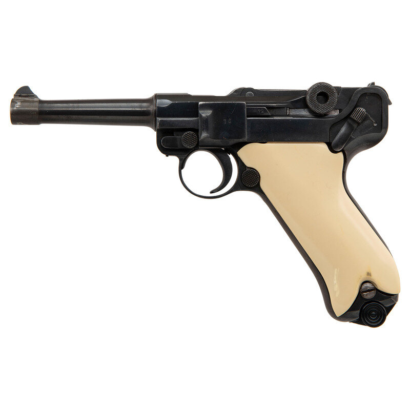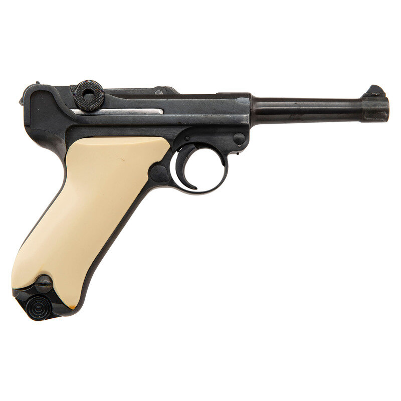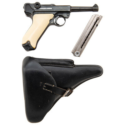 9mm Para. 3.9" barrel length. SN: 2472. Blued metal refinish mounting ill fitting aftermarket synthetic ivory grips with standard fixed rear notch and front blade sights. Short-recoil operated striker action autoloading pistol fed by detachable single stack magazines. Toggle ling struck with the S/42 code indicating it was made by Mauser. Barrel shows no extant markings, and the firearm lacks both a date mark on the barrel extension or any military proofs. Possible faint commercial stamp on the breechblock. Extractor displays standard GELADEN marking but the safety marking has been milled off. Serial numbers mixed throughout. Comes with one non matching wartime magazine with alloy baseplug and chrome plated body, and one post-war magazine with blued body and synthetic baseplug. Comes with reproduction holster that has been artificially aged, and most likely modern production disassembly tool.