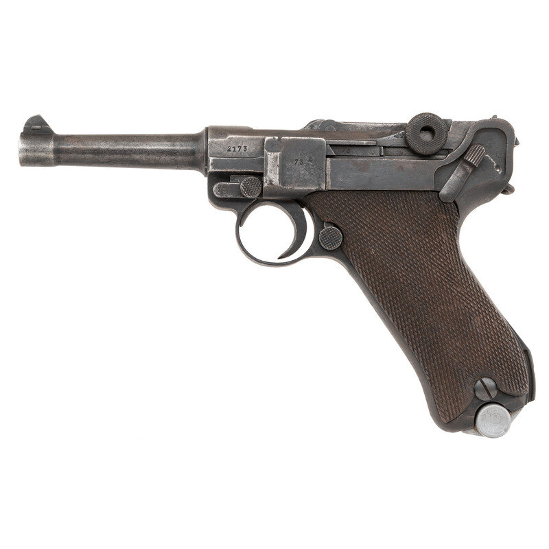 9mm Para. 3.9" barrel length. SN: 2173y. Blued metal refinish overall with fire blued small parts and polished safety mounting checkered walnut grips and fixed rear notch and matted front blade sights. Short recoil operated striker action autoloading pistol fed by detachable single stack magazines and utilizing a toggle action. Toggle link shows the 42 code indicating Mauser manufacture with the barrel extension struck with the date 1939. Right side of the barrel extension is struck with two {Eagle/655} waffenamt markings while the left bolt, right barrel, and right barrel extension display WWII German Eagle proofs. Extractor shows standard GELADEN indicator mark with the safety also exhibiting the standard GESICHERT mark. Serial numbers match to most parts but the grip panels are not numbered, and the pistol comes with a non-matching aluminum base plug magazine with blued body. Comes in a leather Vis 35 pattern holster that has had the twin belt loops replaced with a single large loop. No visible manufacturer markings on holster. Comes with a German leather belt with brass WWII German Eagle embossed buckle, and a partially visible code to the loop reading 0917100.
