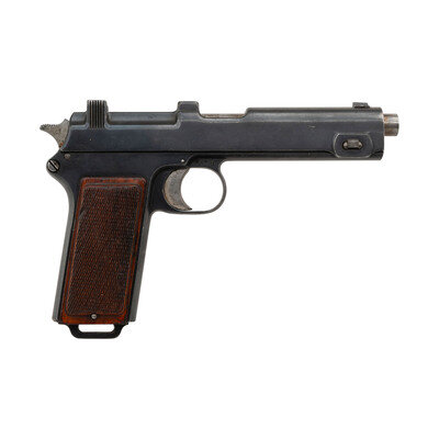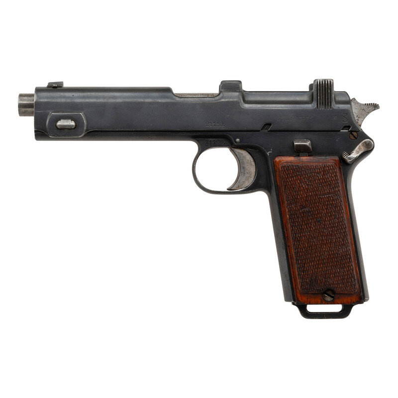 9x23mm. 5" barrel length. SN: 2115k. Blued metal refinish with polished internal surfaces, barrel, and small parts mounting checkered walnut grip panels. Short recoil operated rotating barrel lockup autoloading pistol fed by an internal box magazine charged with stripper clips. Item features fixed rear notch and adjustable front blade sights, and a lanyard loop to the butt. Slide is marked STEYR 1915 with a large S safety marking above the safety notch. Frame struck W-n {Austrian Eagle} 16, with a similar eagle struck into the lanyard loop. Majority of parts are struck with a k inspection mark. Barrel number does not match frame. Dustcover is stamped FOX STUDIOS.