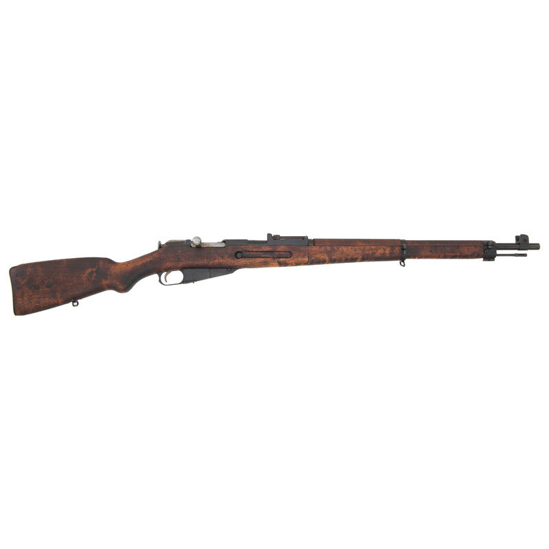 7.62x54mmR. 27" barrel length. SN: 234388. Blued metal finish with polished bolt mounting wood semi-pistol grip stock with spliced forend and full length upper handguard. Bolt-action internal magazine fed repeating rifle mounting adjustable ladder rear notch and front blade sight with protectors. Item is shows the Finnish boxed SA marking above the {Gear S} mark of Sako on the barrel shank with the latter marking appearing to the right butt. Item is dated 1943. Bolt shows Imperial Russian {Bow and Arrow} mark. Forward barrel displays import mark reading CAI ST. ALB. VT/M39 FINLAND 7.62X54R. Serial numbers match on the barrel shank, bolt, and magazine floorplate.