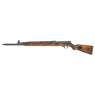7.62x45mm. 20.5" barrel length. SN: A65415. Parkerized metal arsenal refinish overall set in varnished wood semi-pistol grip stock mounting side folding blade bayonet. Short-stroke piston operated semi-automatic rifle operated by an annular gas piston and using a tilting bolt. Left receiver is marked she/007 {Crossed Swords} 57, with the crossed swords indicating Czech military inspection and 57 indicating it was made in 1957. Left receiver lacks the pin installed on examples rechambered for 7.62x39. Serial numbers are mixed. Item comes with no magazine.