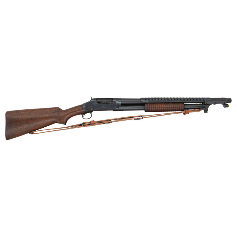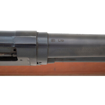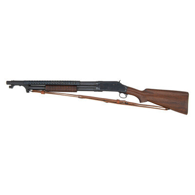 12 Gauge. 20" barrel length. SN: E936426. 2.75" chamber length. Cylinder bore. Blued metal refinish overall set in oil finished walnut stock with fluted comb and corncob forend and mounting four row vented heat shield/bayonet lug. Slide-action repeating shotgun fed by a tube magazine and mounting nickel front bead sight. Standard markings include MODEL 97-WINCHESTER-12 GA./-TRADE MARK- followed by 2 3/4 CHAM./CYL. Standard two-line address and patent mark to the right barrel with both the barrel and receiver struck with Winchester's monogram proof marking. Top of the barrel struck with the later pattern {Ordnance Bomb} beside the proof mark, while the left receiver is struck U.S. {Ordnance Bomb}. Bayonet lug is unmarked, which is correct for World War II vintage Model 97 shotguns. Falls within the known serial number range for World War II Model 97 trench guns. Government documents record serial numbers ranging from 921,300 to 986,300, but Bruce Canfield, in "Complete Guide to U.S. Military Combat Shotguns", notes that most are encountered in the range of 930,000 to 953,000. Item. Item mounts a reproduction Pattern 1907 sling. Shotgun built on takedown frame, typical of World War II trench guns. Canfield notes that the World War II 97s left the factory with varnished stocks, and inspector cartouches. The absence of such markings suggests that the stock must be a replacement. Additionally, the buttplates of World War II Model 97 shotguns were plastic, indicating the buttplate on this is at best a replacement.