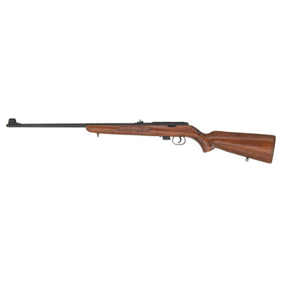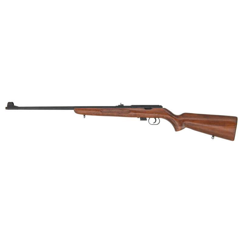 .22 LR. 23.25" barrel length. SN: C2932. Blued metal finish with polished bolt body set in varnished wood semi-pistol grip stock mounting front and rear sling loops. Bolt-action detachable magazine fed repeating rifle mounting three position rear sight and fully hooded front post. Rear sight features three notches calibrated for 25, 50, and 100 meters. Barrel shows IMC2 manufacturer marking over the date of 1981, indicating it was made in Romania in 1981. Serial numbers match on the barrel, receiver, and bolt. Importer mark to lower barrel reads C.A.I. ST. ALB. VT/M1969 .22 CAL. ROMANIA.