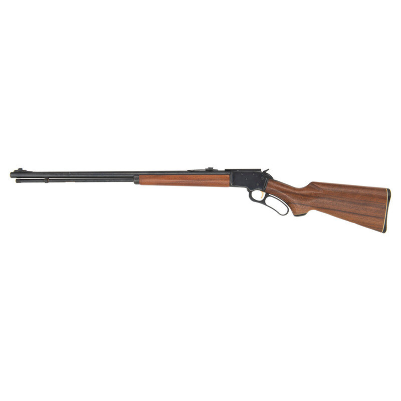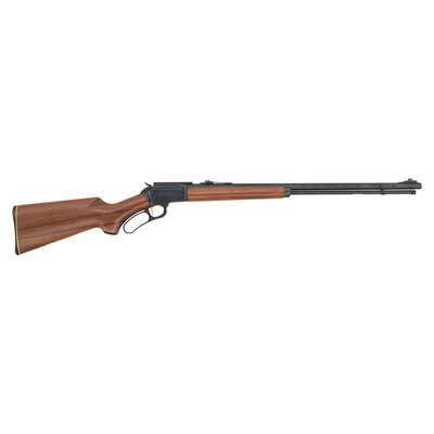 .22 S/L/LR. 24" barrel length. SN: 27128996. Blued metal finish with matte upper and lower flats set in walnut semi-pistol grip stock with white line spacers to the synthetic butt and pistol grip cap. Lever-action repeating rifle fed by an internal tube magazine charged from the front, and mounting folding adjustable semi-buckhorn rear notch and front bead sights. Item further shows a takedown frame and gold trigger, along with a dovetail rail to the receiver for mounting optics. Left barrel marking reads The Marlin Firearms Co. North Haven, Conn. U.S.A./CAL. 22 S. L. & L.R. MICRO-GROOVE BARREL ORIGINAL GOLDEN-39A. Magazine tube ring appears to have been reattached and glued in place. Sling swivel stud to forend cap and toe of stock have been removed.