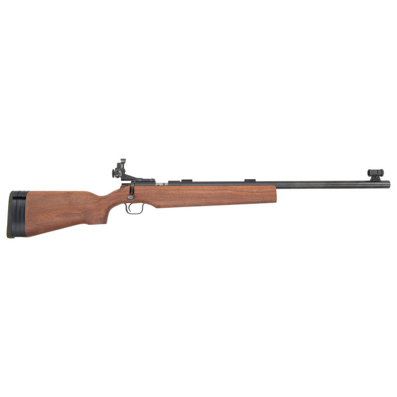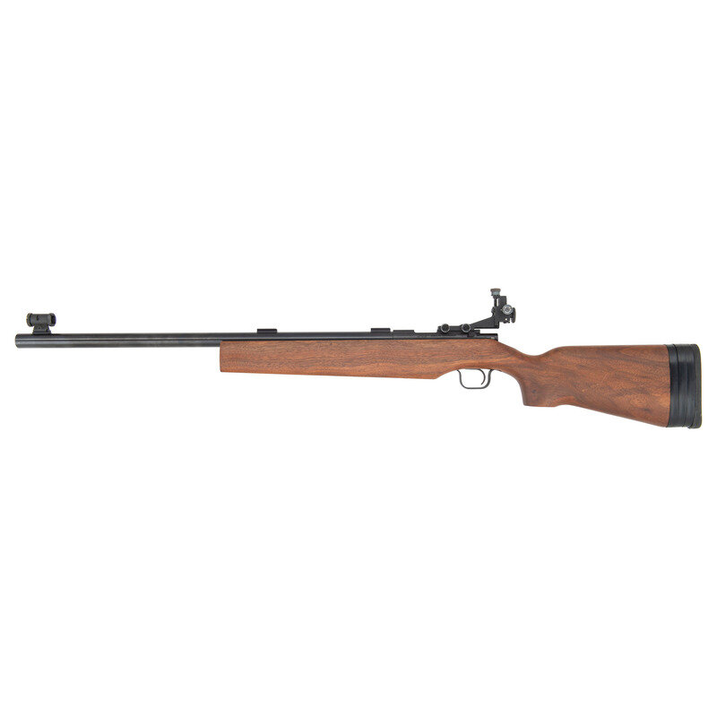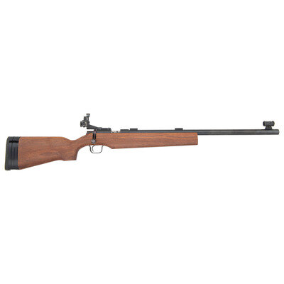 .22 LR. 25.25" barrel length. SN: GM017775. Blued metal finish with polished bolt set in Walnut semi-pistol grip bench rest stock with rail to forend. Bolt action single-shot rifle mounting Kimber marked adjustable rear aperture and tunnel front sights. Barrel fitted with dovetail rail in two places for mounting an Unertl pattern scope. Markings include Kimber MODEL 82 GOVERNMENT to the left receiver with U.S. property stamp above the serial number. Single line address to upper barrel reads KIMBER OREGON, INC, CLACKAMAS, OREGON, U.S.A. with left barrel showing caliber marking .22LR. Rifle is fitted with a Kimber marked rubber recoil pad and three black synthetic spacers.