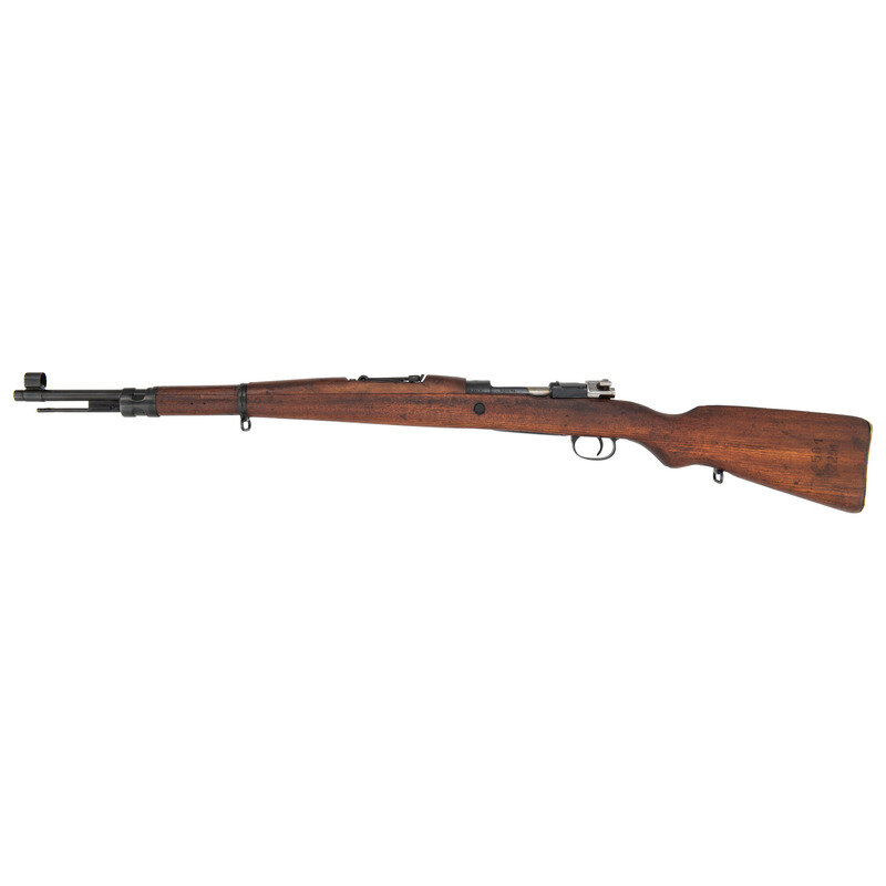 7.92x57mm. 23.4" barrel length. SN: D4581 (Cyrillic). Blued metal refinish with polished bolt and buttplate set in wood semi-pistol grip stock with full length upper handguard mounting an adjustable tangent rear notch and fully hooded front blade sights. Bolt-action internal magazine fed repeating rifle featuring a front sight hood, channel type bayonet lug, and front and rear sling loops. Receiver is struck with the {Seal of Yugoslavia} while the left receiver shows model marking M.24/47. Item shows mixed serial numbers with forced matched magazine floorplate.
