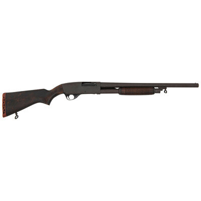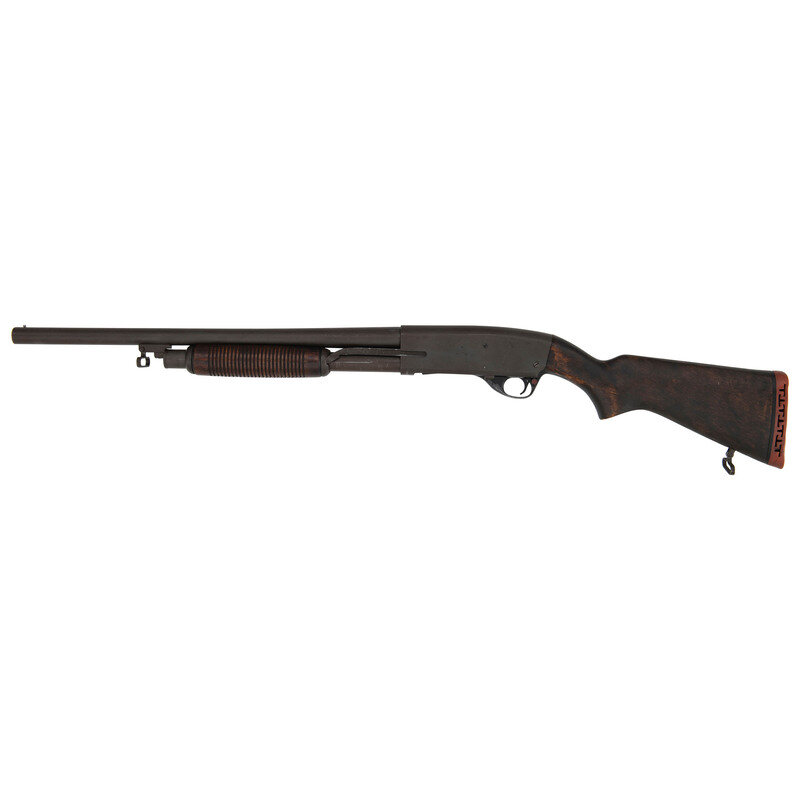 12 Gauge. 20" barrel length. SN: 35992. 2.75" barrel length. Full Choke. Parkerized metal finish with blued bolt, and black Anodized finished triggerguard mounting walnut semi-pistol grip stock, corncob forend, and factory rubber recoil pad. Slide action repeating shotgun fed by a tube magazine below the barrel fitted with sling loops to toe and to the front tube mount. Standard markings include STEVENS SAVAGE ARMS CORPORATION/WESTFIELD, MASS. U.S.A. MODEL 77E. Item is struck with P pressure proofs to the forward receiver and rear barrel, with right receiver additionally struck U.S. Left stock weakly struck RRAD for the Red River Army Depot, where a number of these shotguns were refinished and serviced after the Vietnam War. The shotguns purchased for US Government service featured Cylinder bore barrels, but this example features a full choke, suggesting it was modified or possibly assembled after the fact.
